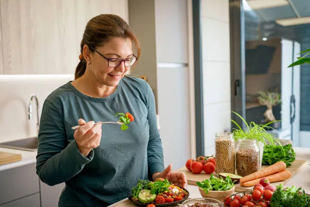 A diet rich in fruits, vegetables, whole grains, and lean proteins supports overall health. Phytoestrogen-rich foods such as soy, flaxseeds, and chickpeas can mildly mimic estrogen, reducing hot flashes and mood swings. Adequate calcium and vitamin D intake also strengthen bones, which are at higher risk of osteoporosis after menopause.